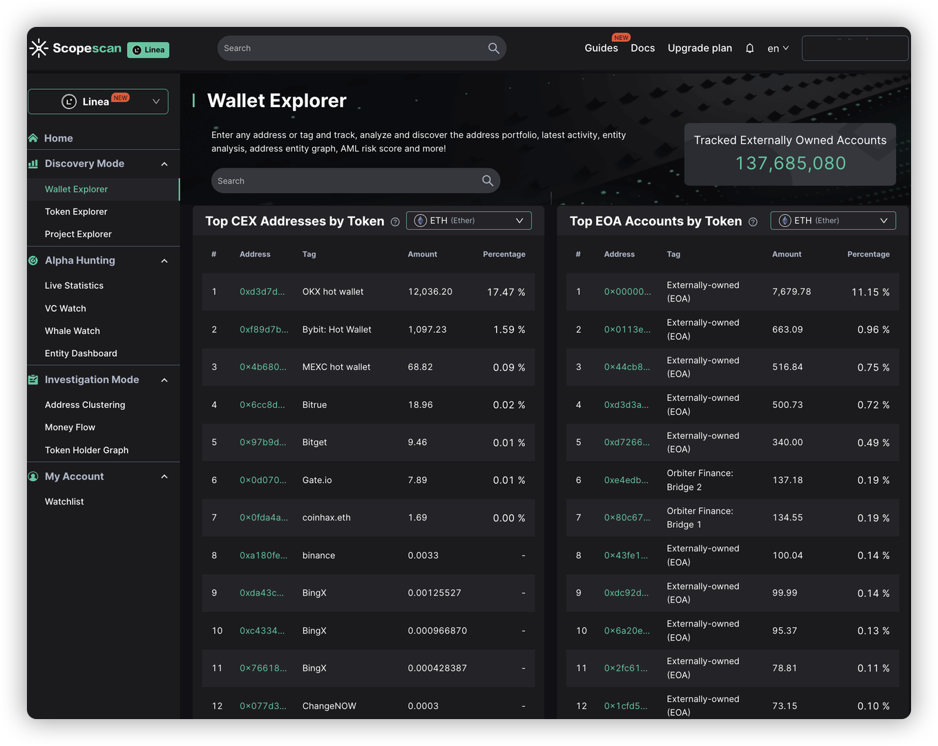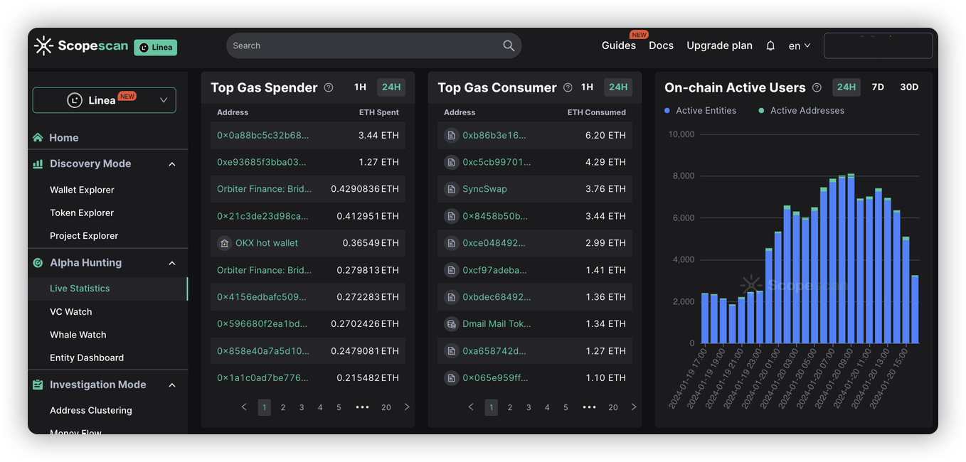 Scopescan is equipped with a variety of tools that help the Linea community better understand users, projects, and their interconnections. Here are the three categories through which Scopescan's lineup of tools are categorized: