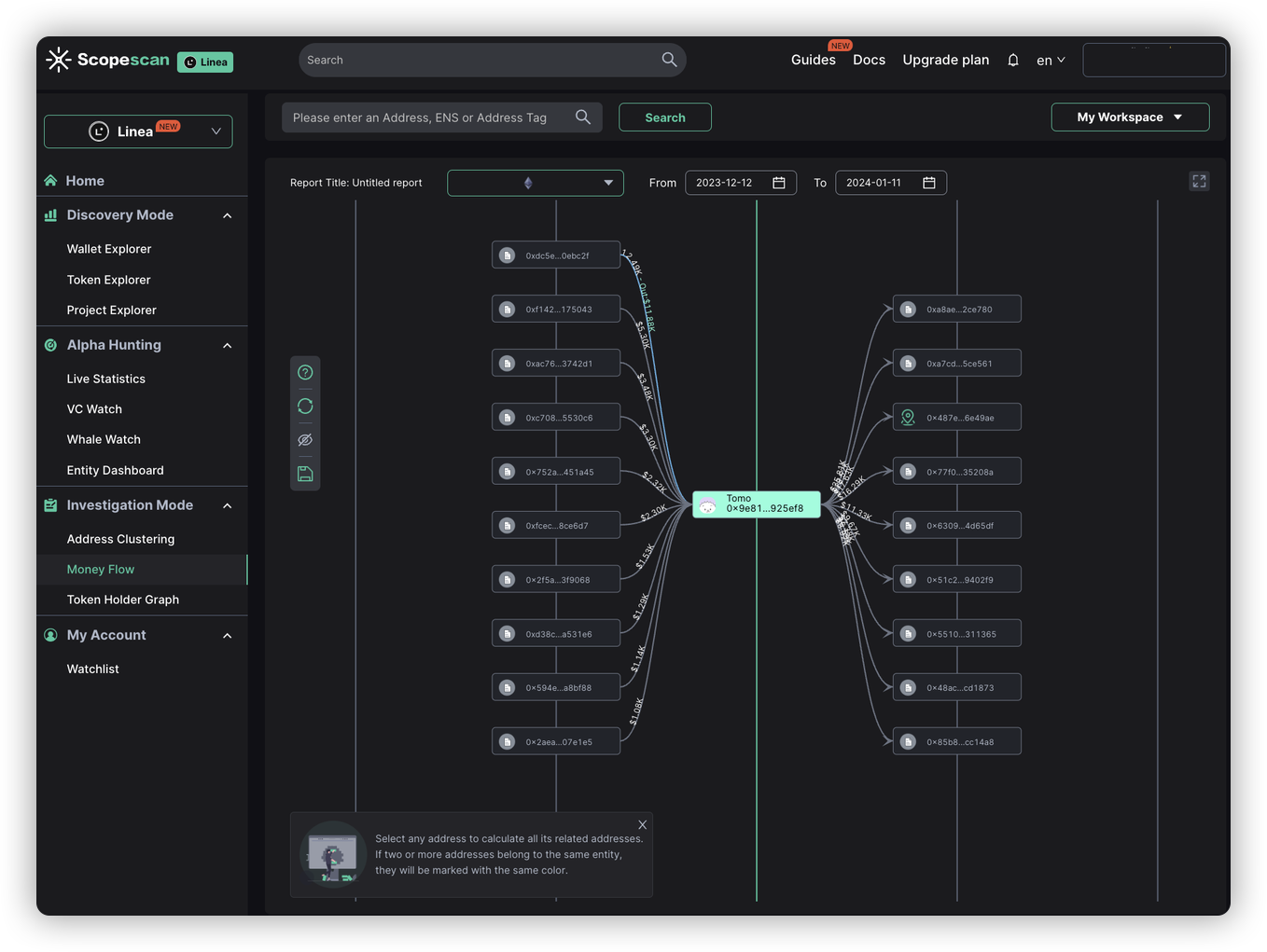 Under Investigation Mode, there are several tools focused on transactions and token analytics. For instance, the Address Clustering tool (first picture below) allows you to generate an address graph that visualizes likely connected addresses, based on a search for a single address. Meanwhile, the Money Flow tool (second picture below) allows users to investigate, track and share relevant information on blockchain transactions.
